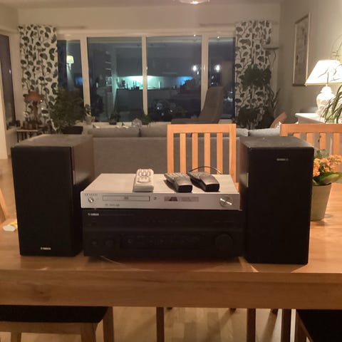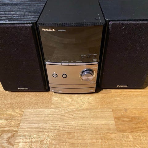 Panasonic stereopakke med to høyttalere og fjernkontroll. Enheten har flere knapper for kontroll og tilkoblinger på baksiden. Designet for å gi lydavspilling i hjemmet med enkel betjening.