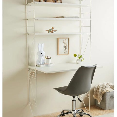 Vegghengt hvit skrivebord med 3 hyller over og 3 små skuffer under. String look-alike fra Alice & Fox.