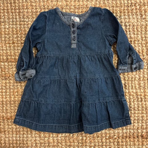 Blå Polarn O. Pyret denimkjole / olakjole 68, 4-6 måneder. Kjolen har knappelukking på skuldrene og en liten lomme foran.