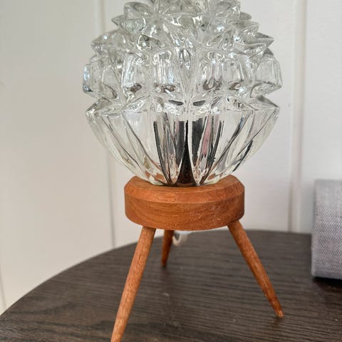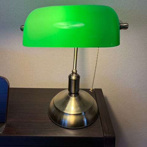 Bordlampe/ advokatlampe. Noen bruksmerker på foten. Noe skjev støpsel, men fungerer helt fint. Må hentes.