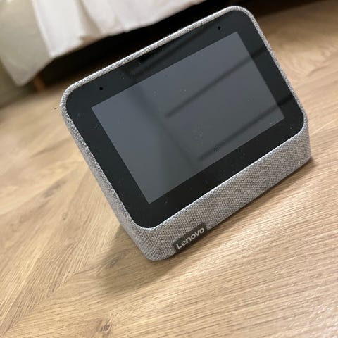Lenovo Smart Clock med Google Assistant, kledd i grått stoff.