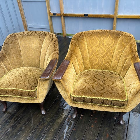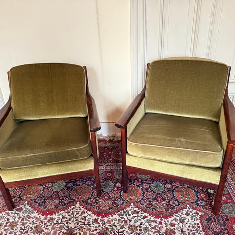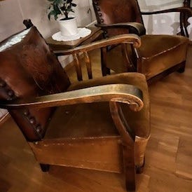 To kule stoler i tre med blått stoff i setet og flettede lærremmer i ryggen.