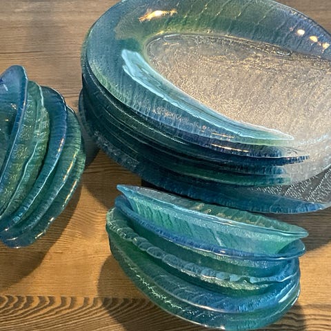 Magnor Glassverk skalldyrservise bestående av 23 deler. Selges samlet for 2000. Ved stykkpris se pris i teksten under bildene