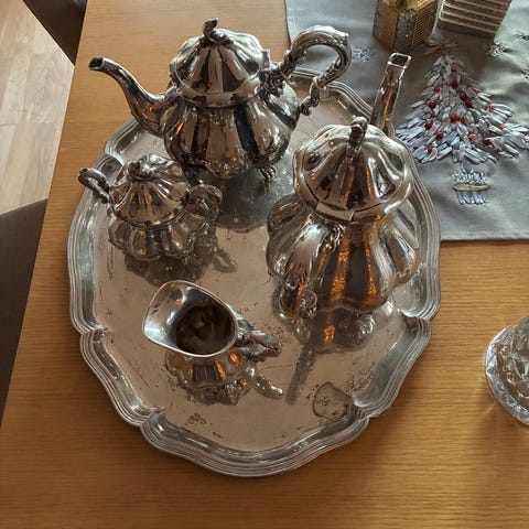 Sett med bestikk i sølvplett bestående av skjeer og serveringsredskaper. Bestikket har dekorative håndtak med detaljer i klassisk design. Passer til servering og spising, egnet for både hverdag og spesielle anledninger. Selges samlet - pent på bordet, eller en rimelig gave .