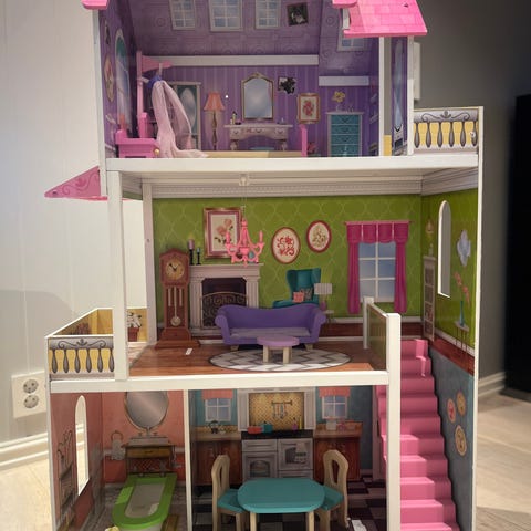 IKEA dukkehus i tre med rosa detaljer. Dukkehuset har flere rom og åpne dører for enkel tilgang til interiøret. Passer for barn som liker å leke med dukker og innredning. Følger med en trapp