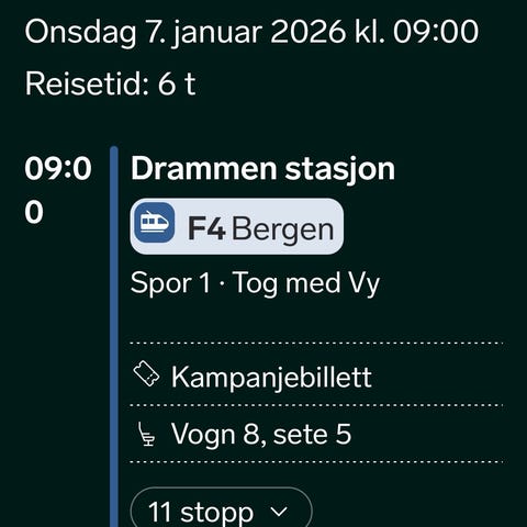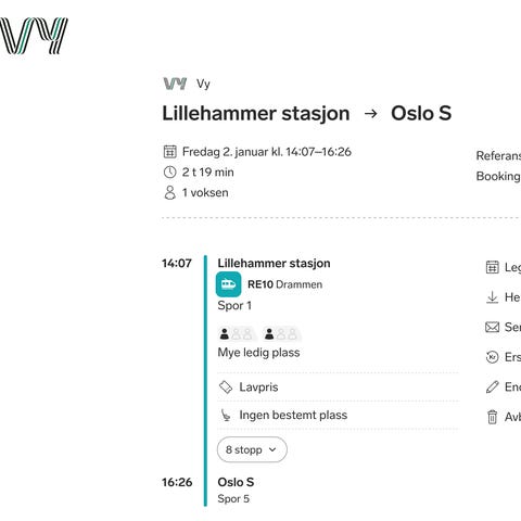 Vy RE10 togreise fra Lillehammer stasjon til Drammen med avgang kl. 11:11 og ankomst kl. 13:34. Turen varer i 2 timer og 23 minutter og går via Spor 1 på Lillehammer stasjon.