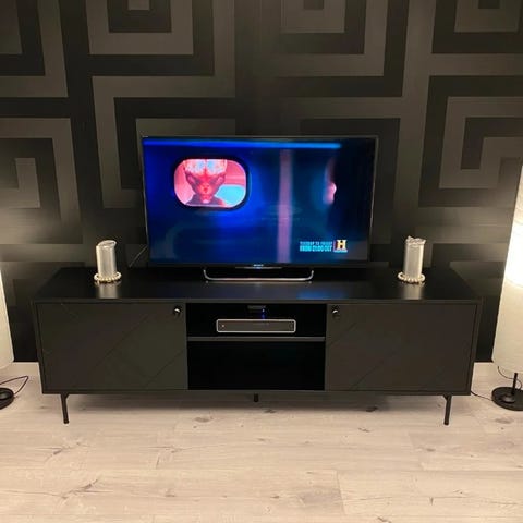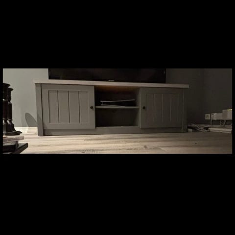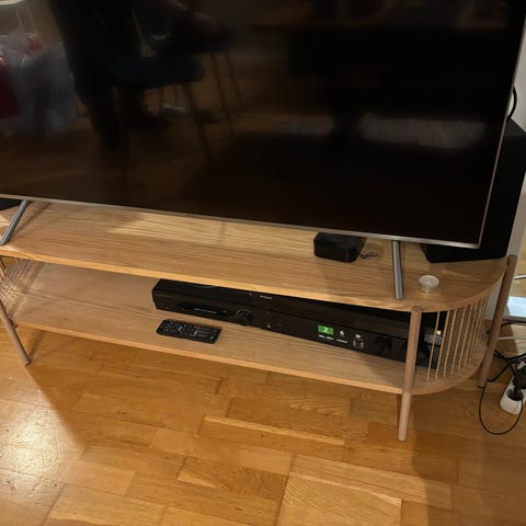 Fin å solid tv benk med sort glassplate på toppen selges
