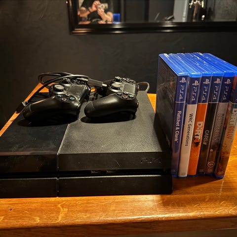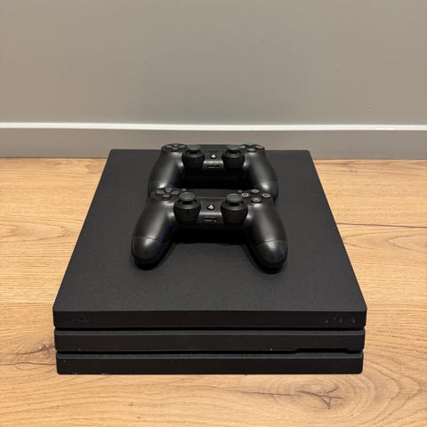 PlayStation 4 spillkonsoll med trådløs kontroller. Konsollen har et kompakt design og svart farge. Passer for bruk med PlayStation 4-spill og tilkobling til TV eller skjerm.