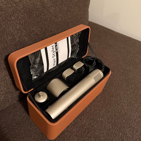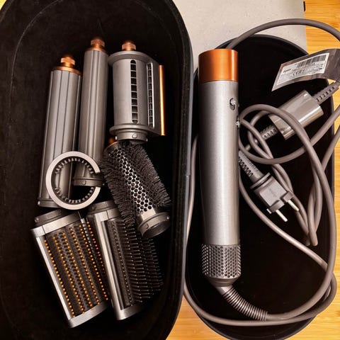 Dyson Airwrap hårstyler sett med flere tilbehør inkludert børster og stylingverktøy. Enheten har ledning og er designet for hårstyling med ulike børstealternativer for variasjon i frisyrer.