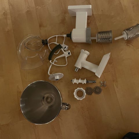 Kenwood kjøkkenmaskin med tilbehør inkludert kjøttkvern og blender. Maskinen har 2 store blandeboller, visp, deigkrok og flere ekstra deler for ulike kjøkkenoppgaver. Farge: hvit. Materiale: plast og metall. Egnet for generell matlaging og baking.
