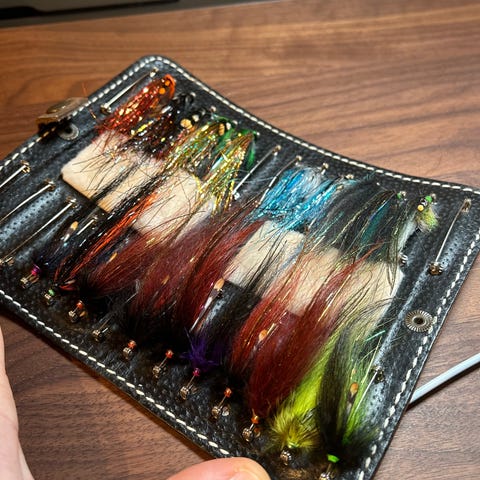 Eksklusivt flueskrin med plass til mange fluer. Denne er håndlaget i okseskinn og fremstår som et 100% kvalitetsprodukt, men en solid låsemekanisme.