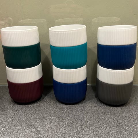 Et flott krus i porselen og silikon i serien Fluted Contrast fra danske Royal Copenhagen. Formgitt av H. C. Gjedde. Farge Caribbean.