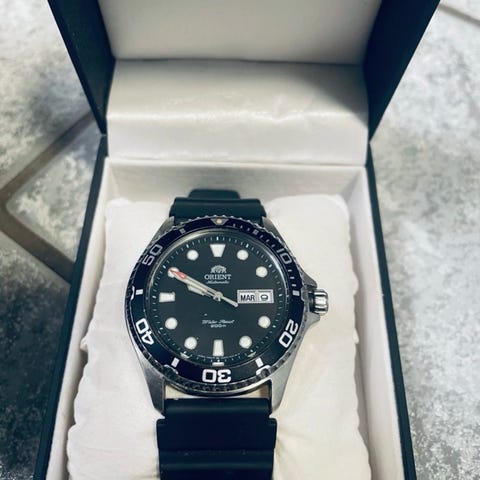 Orient herreklokke med hvit urskive og svart skinnrem. Klokken har automatisk mekanisk urverk, synlig bakside i glass, og visere med tydelige markeringer. Egnet for daglig bruk og formelle anledninger.