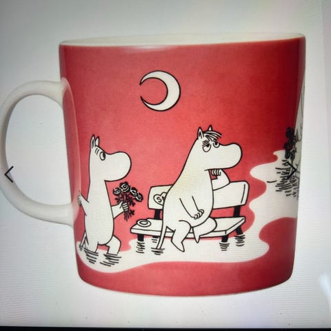 Lite brukt Mummi kopp med blå bakgrunn og motiv av Too-tikki.