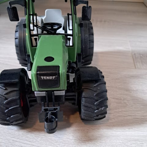 Fendt traktor med tilhenger. Stor, ca 86 cm traktor + tilhenger + gravemaskinfestet. Traktor uten gravemaskinfestet er ca 30 cm lang og 20 cm høy. Kvalitetsleke.