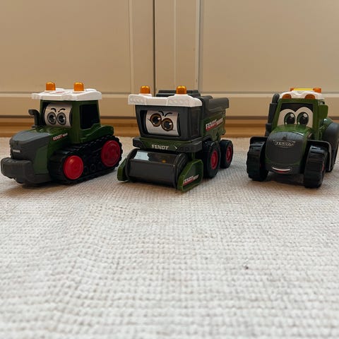 Kun brukt inne. Lite brukt og alt virker som det skal. Dører, takluke, tippemekanisme på tilhenger og gravemaskin på traktor. Tilhenger kan tas av. 4 klistremerker av dyr limt på henger, veldig lette å ta av om ønsker.