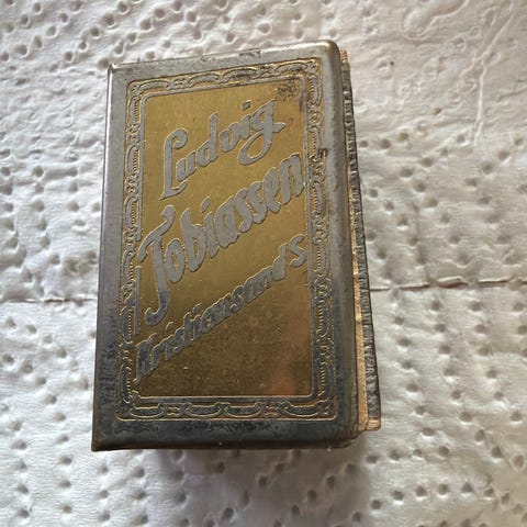 Fyrstikk holder i tinn eike mønster og en tom gammel fyrstikk eske selges samlet