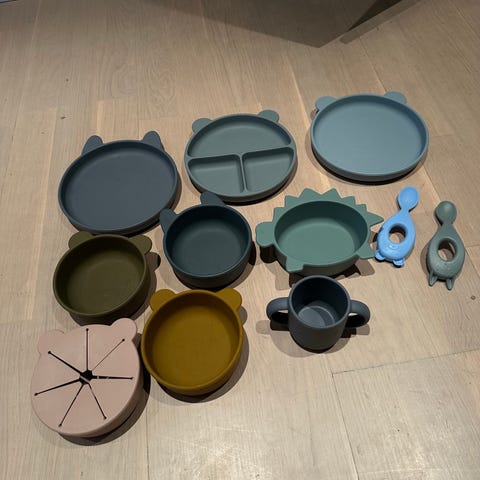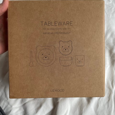 Svært pent brukt sett fra Liewood med tutekopp, bestikk, skål og tallerken. Tåler oppvaskmaskin og mikrobølgeovn.
