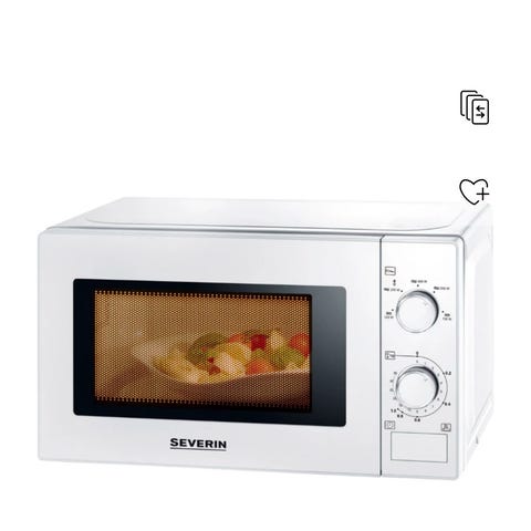 Logik mikrobølgeovn i hvit farge. En enkel og funksjonell mikrobølgeovn med manuelle kontrollknapper for justering av tid og effekt. Egnet for oppvarming og tining av mat.