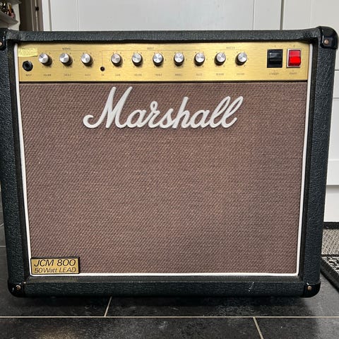 Marshall gitarforsterker med tilhørende høyttaler. Passer til bruk med elektrisk gitar.