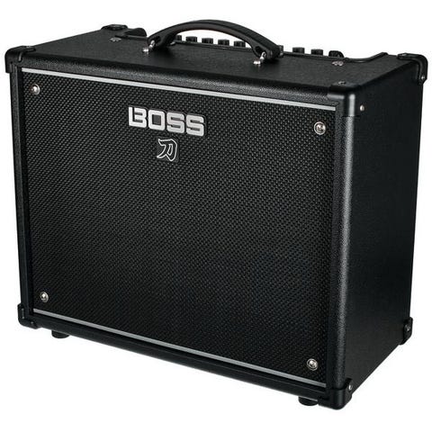 Boss Katana 100 gitarforsterker med svart finish. Forsterkeren har en effekt på 100 watt og er designet for bruk med elektrisk gitar. Den har en robust konstruksjon og bærbar design med håndtak på toppen. Boss katana mk2