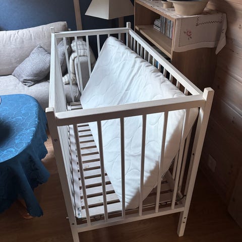 Sprinkelseng selges. 120x60. Madrassbunnen kan plasseres i to forskjellige høyder. Madrassen kan følge med.