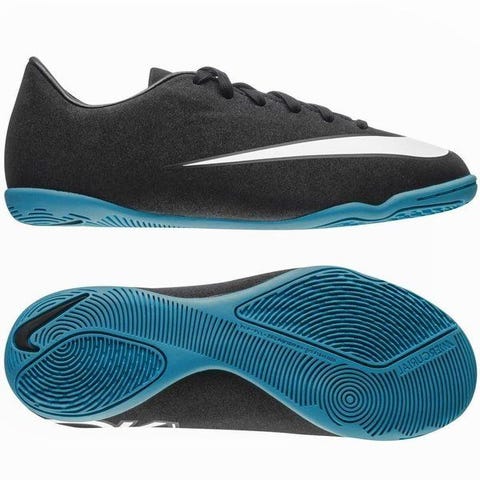 Nike CR7 innendørs fotballsko med flerfarget design. Skoene har en svart base med fargerike detaljer og hvite Nike-logoer. Egnet for bruk på innendørs fotballbaner.