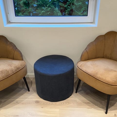 To kjempefine, moderne lenestoler selges helst samlet for kr 1100,- eller 600 pr stk. Lite brukt og fremstår som nye. Behagelige å sitte i. Mørk grå fløyel med sorte ben.