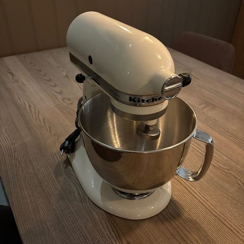 Pent brukt kjøkkenmaskin. Utstyrt med to stål boller og en keramikk bolle. En visp, en eltekrok og to flatvisper med og uten gummikant.