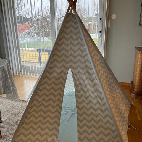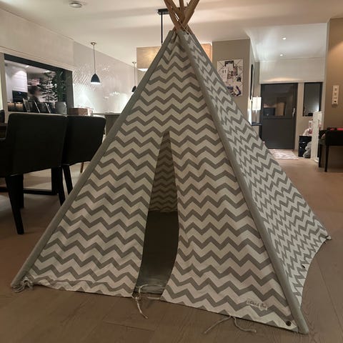 Alice & Fox Barnetelt i beige. Teltet har vinduer og dør med knytebånd, laget av tekstilmateriale. Passer for barn og kan brukes som leketelt eller interiør i barnerom.