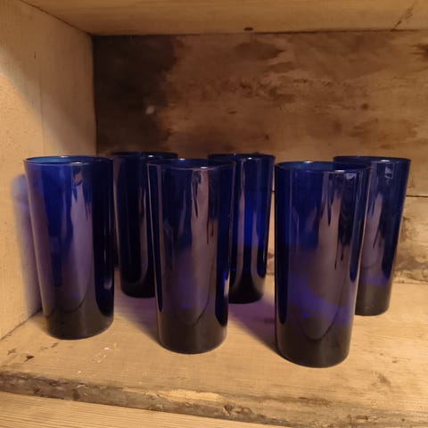 Selger et pent retro drikkeglass i dyp koboltblå farge, produsert i Frankrike.