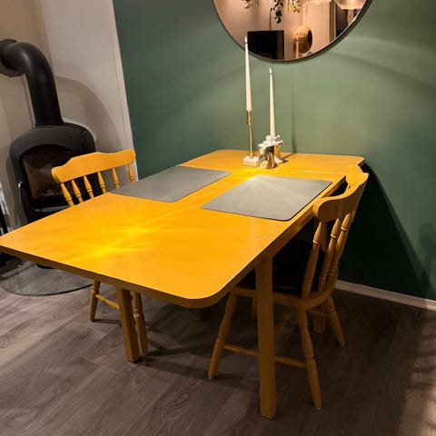 Fint spisebord med ileggsplate gis bort grunnet vi fått nytt bord. Hentes på Grünerløkka snarest :) 130 cm, med ileggsplate på 35 cm som henger på ene siden så kan den bli totalt 165 cm. Er et furubord som blitt malt over i brun farge.