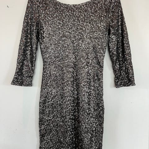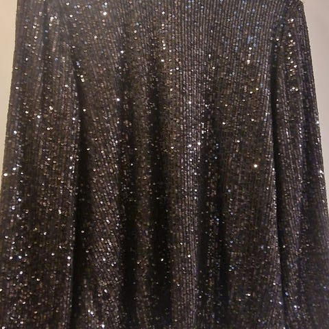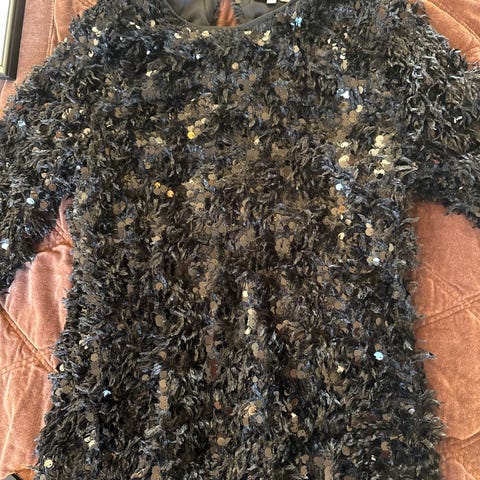 Bluse med påsydde paljetter, v-hals og innsnitt ved bryst. Den har lange ballongermer som er smalere nederst for en pen look. Den er tynt fòret.