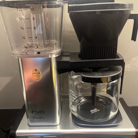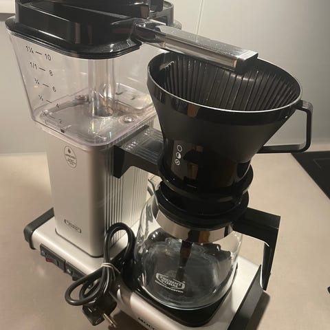 Moccamaster kaffetrakter med glasskanne. Kaffetrakteren har en svart farge og inkluderer en målebeger for vannmengde. Den har et filter og en varmeplate for å holde kaffen varm. Strømkabel med plugg er inkludert.
