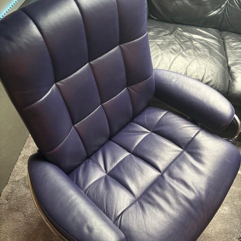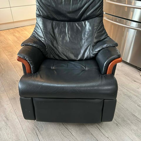 Regulerbar stor lenestol med krakk. Lyst kunstskinn og mørk brunt tre understell med sving. Lite brukt.