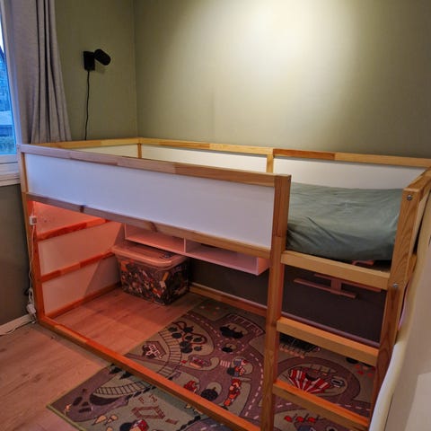 IKEA enkeltseng 90x200 cm med oppbevaringsskuffer i hvit utførelse. Sengen har integrerte oppbevaringsløsninger under soveområdet, inkludert skuffer og åpne hyller, som gir ekstra plass til oppbevaring. Passer for barn og kan brukes i barnerom. Nypris 4195 kr. To av skuffene er litt treige men fungerer.