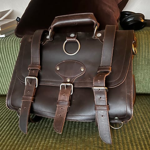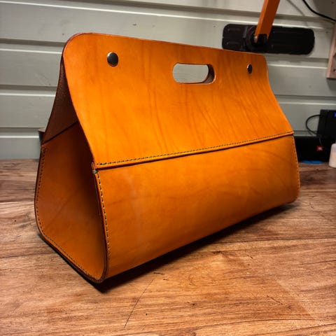 Håndlaget verktøyveske med flettet mønster i lær. Vesken har en varm brun farge og detaljert tekstur i flyttingen som gir et klassisk utseende. Egnet for bruk til både verktøy eller som klassisk veske. Leveres med bærereim.