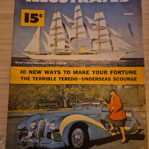 Vintage mechanix Illustrated Magazine med artikler om biltema, økonomi og boligbygging..m.m