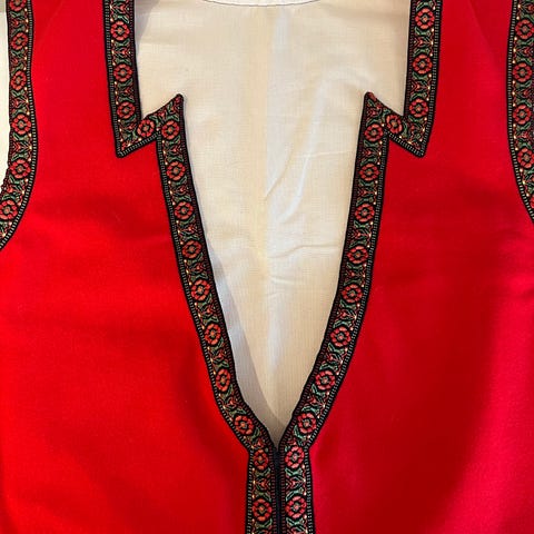 Burgunder vest sydd i ullklede og bånd fra Møre bånd og vev.