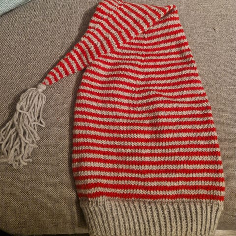 Pent brukt nisseluer hjemmestrikket i rødt garn og tovet. Svært varme og gode! De to største er 78 cm lange, den siste litt mindre i hodeomkrets og 68 cm lag. Selges for 250kr per eller 600 samlet. Kan hentes i Larvik eller sendes mot at kjøper dekker frakt.