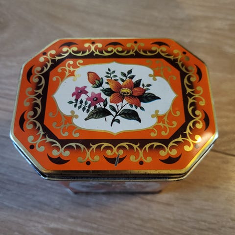 Vintage retro metallboks med imitert trelokk og blomsterdekor