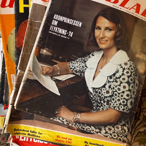 En bunke med gamle norske ukeblad fra 40 og 50 tallet