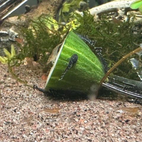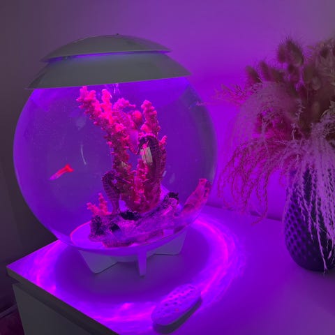 biOrb akvarium Oase med rund form og gjennomsiktig glass/plast. Inkluderer dekorasjoner som kokosnøtt-hule og kunstige planter i lilla farge. Egnet for små akvariefisk eller som dekorasjon.