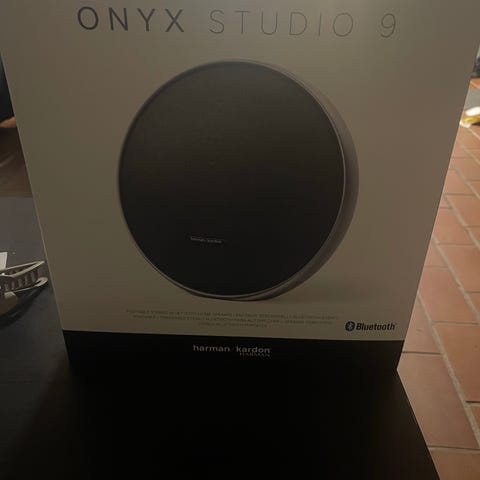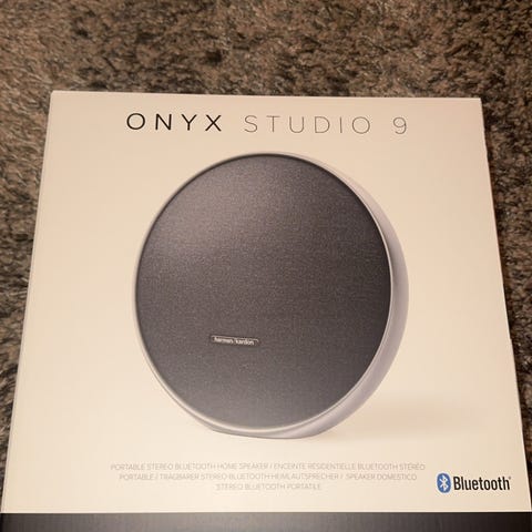 Harman Kardon Onyx Studio 9 Bluetooth-høyttaler i svart farge. Designet for trådløs lydavspilling med innebygd Bluetooth-tilkobling. Har en rund form med stoffdeksel og metallramme. Passer for bruk i hjemmet eller andre steder der trådløs lyd er ønskelig.