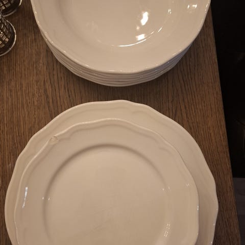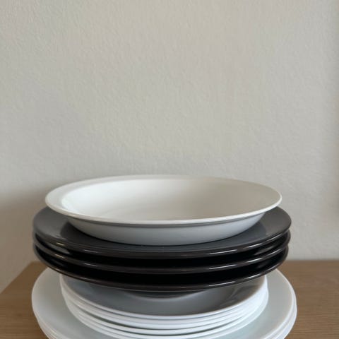 IKEA tallerkensett i svart farge. Inkluderer flere tallerkener i samme design. Noen av tallerkenene har synlige merker eller skader.