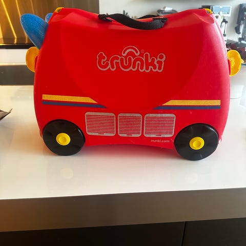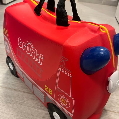 Trunki brannbil barnekoffert i rød farge. Kofferten har hjul og skulderstropp for enkel transport. Den er designet for barn og har et lekent brannbilmotiv. Innvendig rom med elastiske stropper for sikring av innhold.