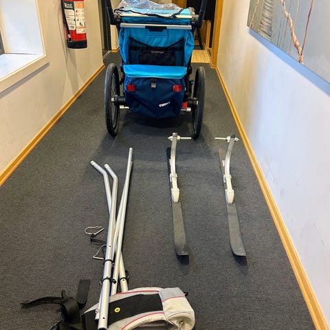 Det følger med sykkelfeste og singel hjul til løping som er avbildet. Ski kan eventuelt kjøpes ved siden av om man ønsker dette.