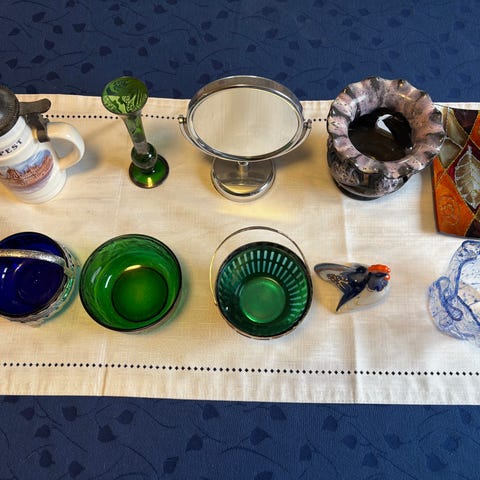 Selger en fin samling med variert glassutstyr samlet. Her finner du alt fra dekorative vaser til praktiske flasker for kjøkkenet. Alt er helt og i god stand - selges samlet.