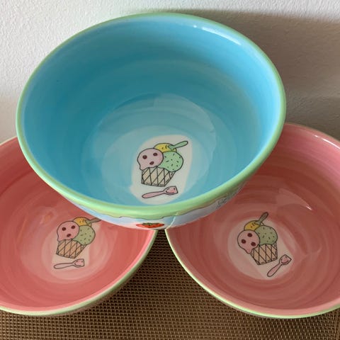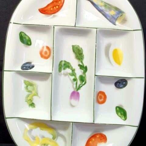 Dekorativt sett i glasert keramikk fra Fapor Portugal, bestående av en stor /fat/middagstallerken på ca. 27 cm i diameter og et beger/kopp på rundt 14 cm høyde.