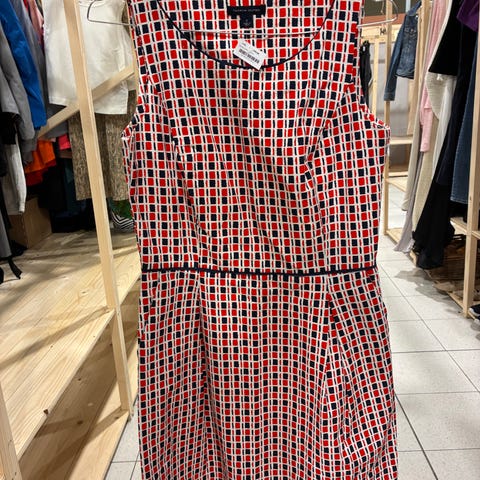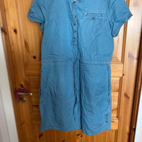 Fin hverdagskjole i deilig bomullskvalitet. Behagelig å ha på. Trekvart lange ermer, romslige skrålommer og utskrådd/A-formet skjørt. Lengde ca 100 cm, over skuldre ca 37 cm, under erme ca 50, liv ca 45 cm.